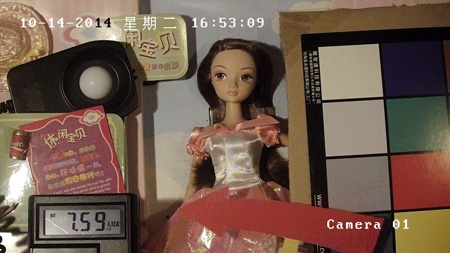 把 摄像机置于暗箱当中,同时对着暗箱里的布娃娃、照度计以及摇摆件,随着照度不断的降低,在6Lux之前,画面色彩保持良好,无明显噪声、色衰现象出现,摇 摆件动态轨迹清晰,无拖影、卡顿等现象;继续降低至4.5Lux时,有轻微色衰、噪声出现;最后降至1.7Lux左右切换至黑白模式,切换前噪声明显,摇 摆件出现拖影情况,但不影响日常监控,切换后噪声一扫而空,布娃娃细节变好,层次分明,摇摆件动态轨迹顺畅、不卡顿、无拖尾,最后降低照度值为 0.00Lux(实际为0.001-0.009Lux之间),噪声较多,但布娃娃轮廓可见。此外,在彩色模式下测得最低照度为0.01Lux,画面色彩丢 失严重,但整体画面轮廓仍可轻松辨识。