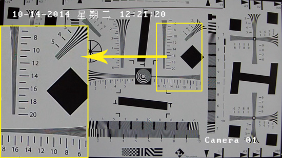 检测1-清晰度:将摄像机在最低变倍下对准清晰度测试卡,发现水平清晰度达到1100TVL,垂直清晰度达到1050TVL,边缘清晰度则为900TVL,画面效果不错;